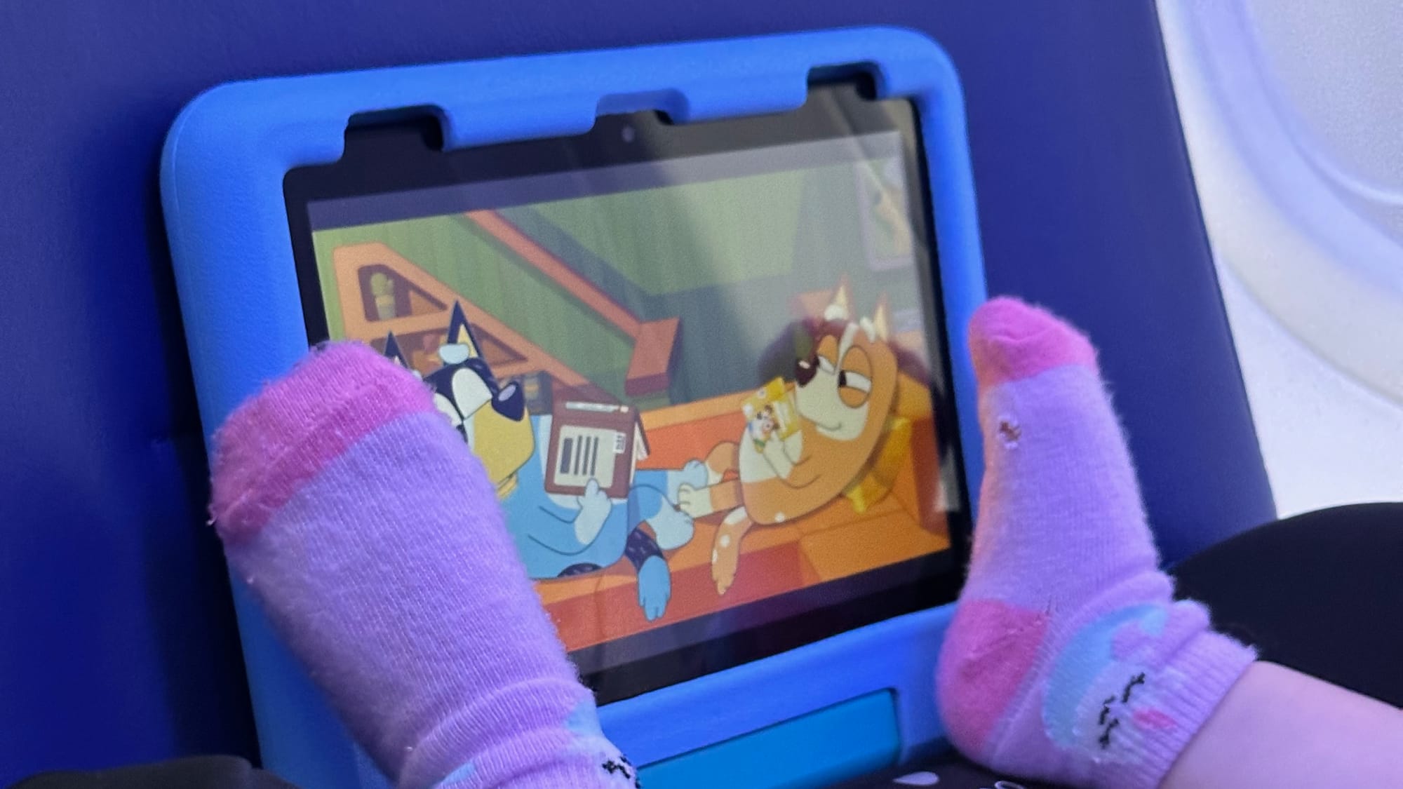 So far we've managed to keep our child away from tablets at home, but we've found that having one available for the plane has been a life saver. We bought the cheapest kid Fire Tablet available from Amazon, installed Disney+, and downloaded³ a bunch of Bluey episodes before the flight.