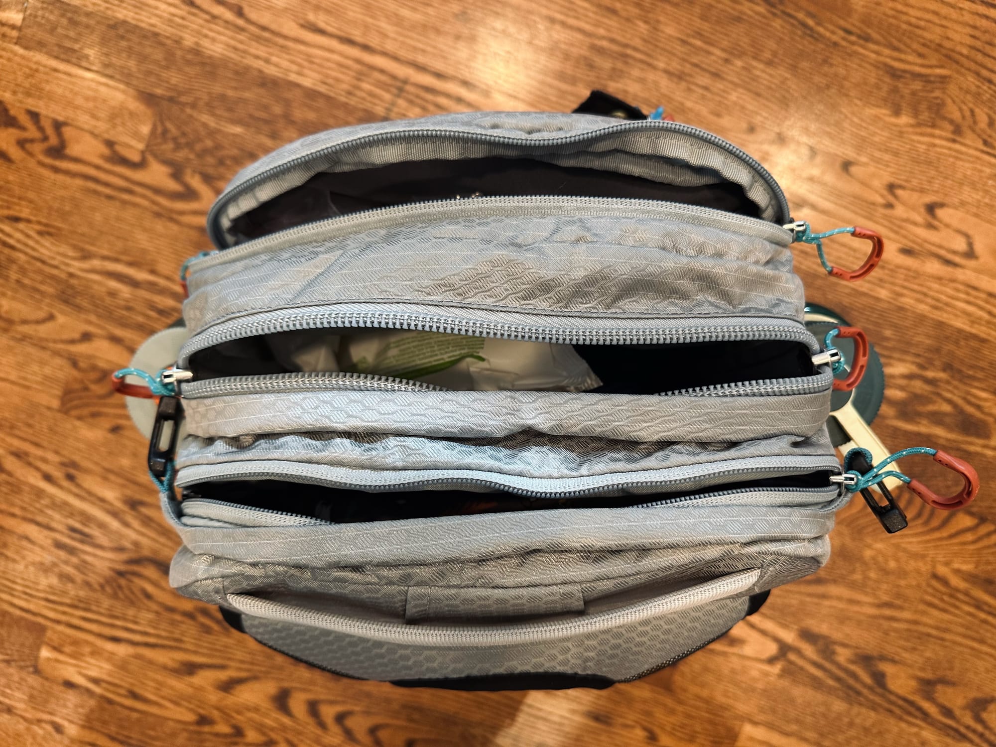 In the external pocket, as well as in one of the smaller internal pockets, we carry plenty of baby snacks as well as some cleaning supplies and other snacking gear.